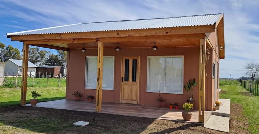 Las paredes exteriores revestidas en fibrocemento de 6 mm de espesor, (placa cementicias totalmente hidrófuga y no envejece), clavado a la estructura de la pared. (Admite su posterior colocación de lajas, ladrillos a la vista, piedras, salpricret, revoques o pinturas)