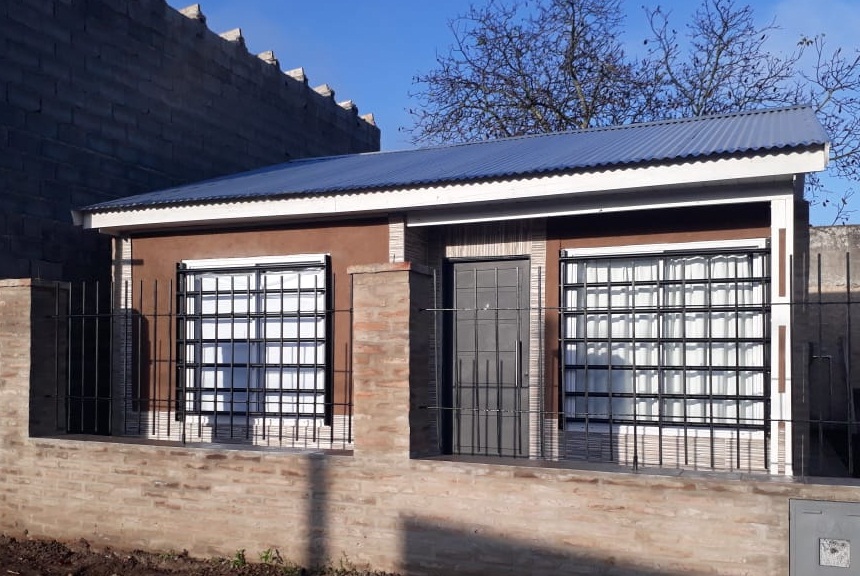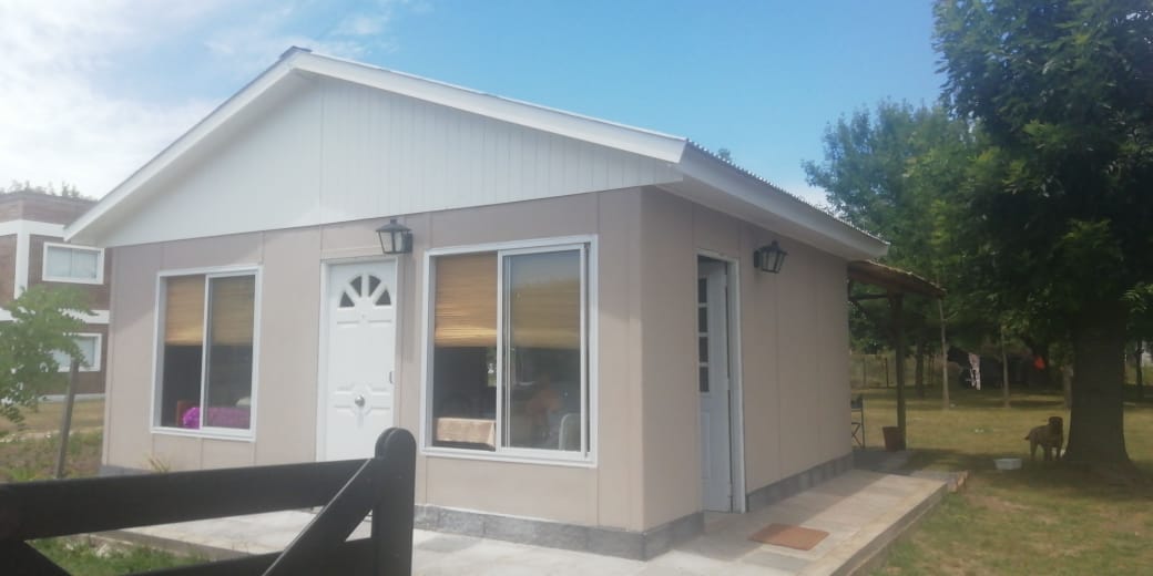 Las paredes exteriores revestidas en fibrocemento de 6 mm de espesor, (placa cementicias totalmente hidrófuga y no envejece), clavado a la estructura de la pared. (Admite su posterior colocación de lajas, ladrillos a la vista, piedras, salpricret, revoques o pinturas)